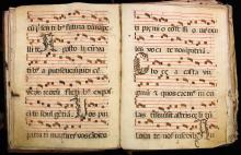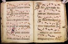 The time signature (C cut sign) at the beginning of the chant and the chant's musical notation itself indicate a particular notation and use of rhythm.