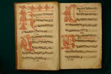 Elaborate calligraphic initials in red ink on opening folio spread.